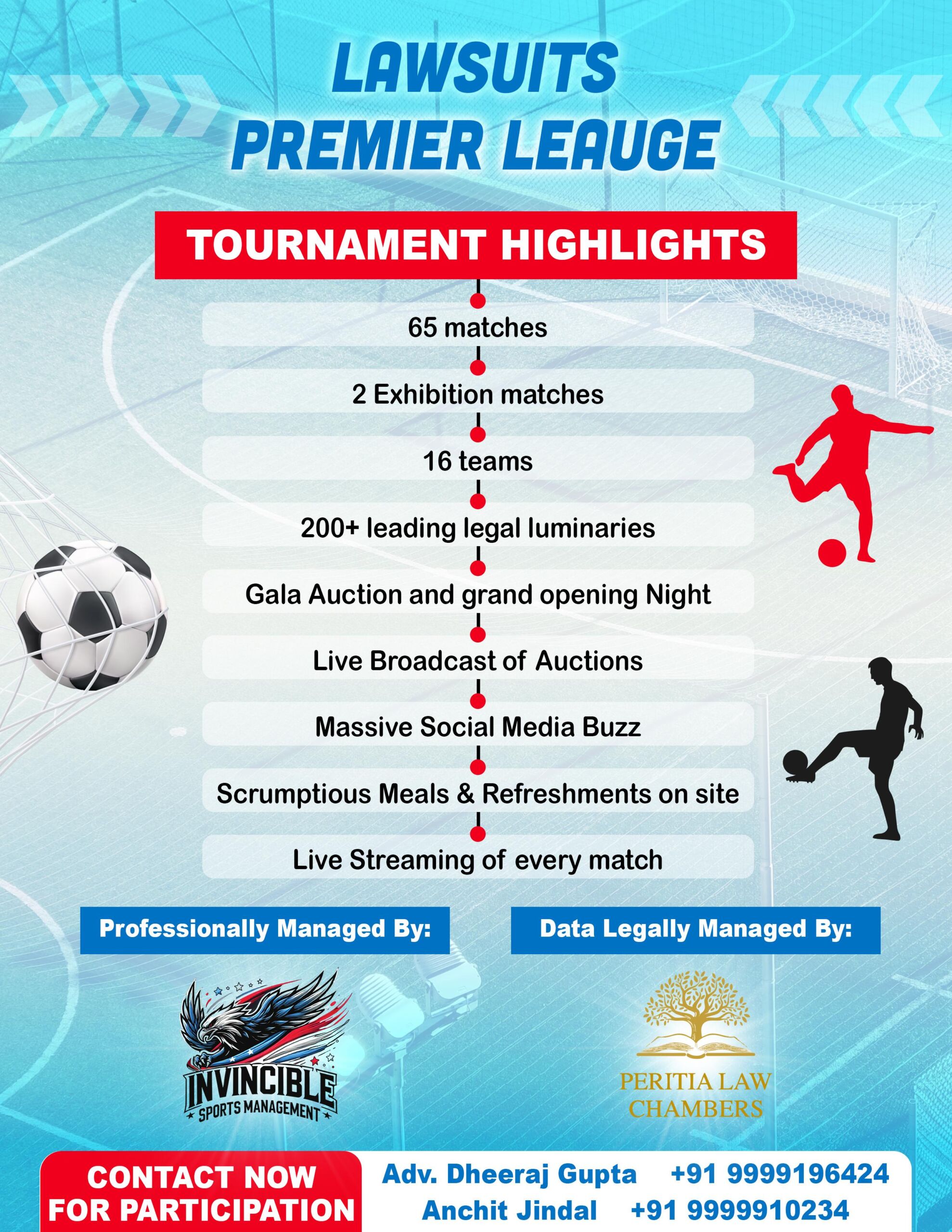 Do not miss the upcoming game Lawsuits Premier Leauge Name Age DOB Email Instagram profile link Facebook profile link Phone Number Bar Council Id Female Yes No Plus 40 Player Yes No Blood Group Emergency Phone Number College Details of Past Tournament Participated Photograph Position Preferred Forward Defender Goal keeper Midfielder Send Fee : 2500 Gst : 18% Amount : 2950 Privacy Policy Terms and Conditions Refund Policy